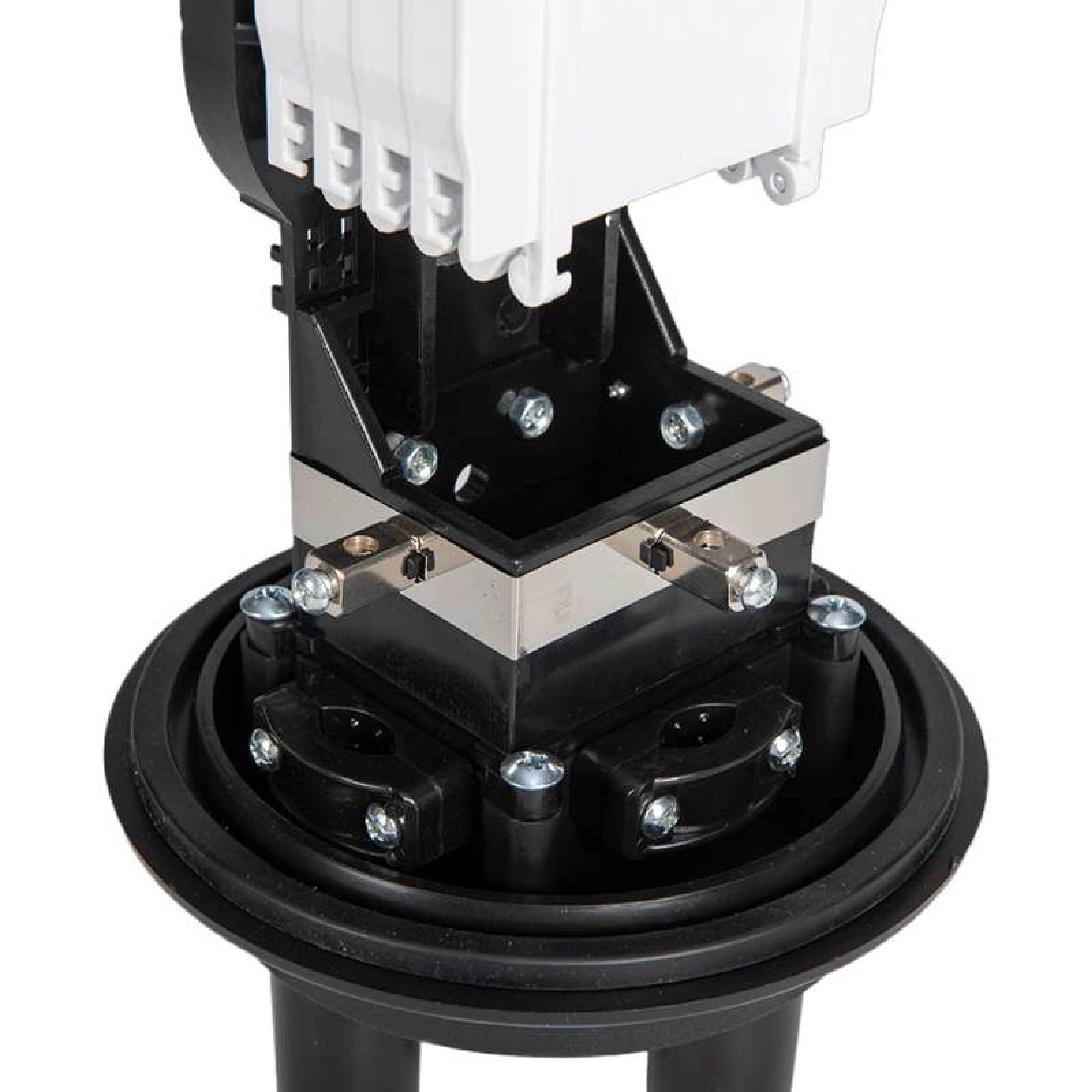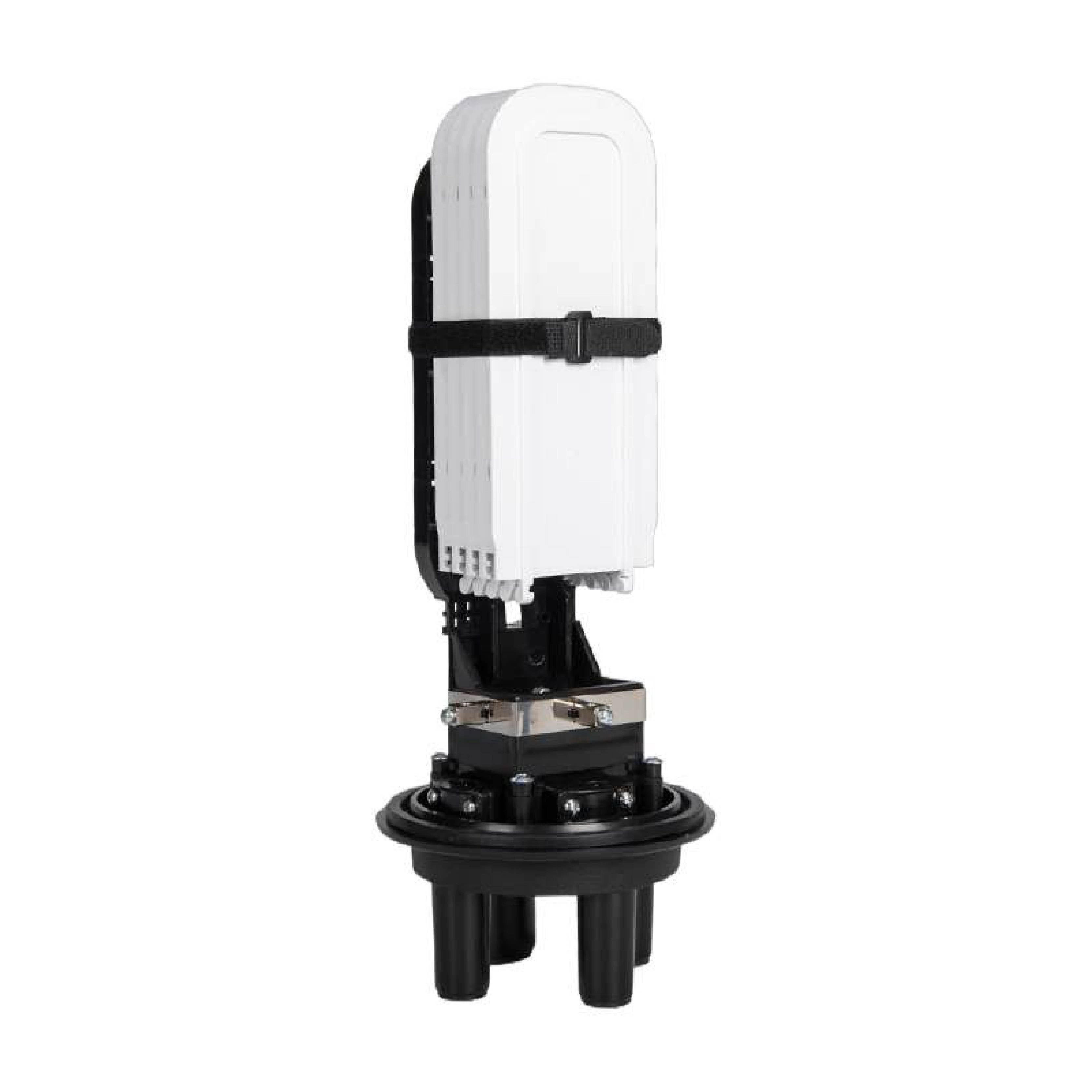 High-capacity fiber dome splice closure with heat-shrink sealing for aerial/pole/duct mounting, scalable up to 96 fiber cores.