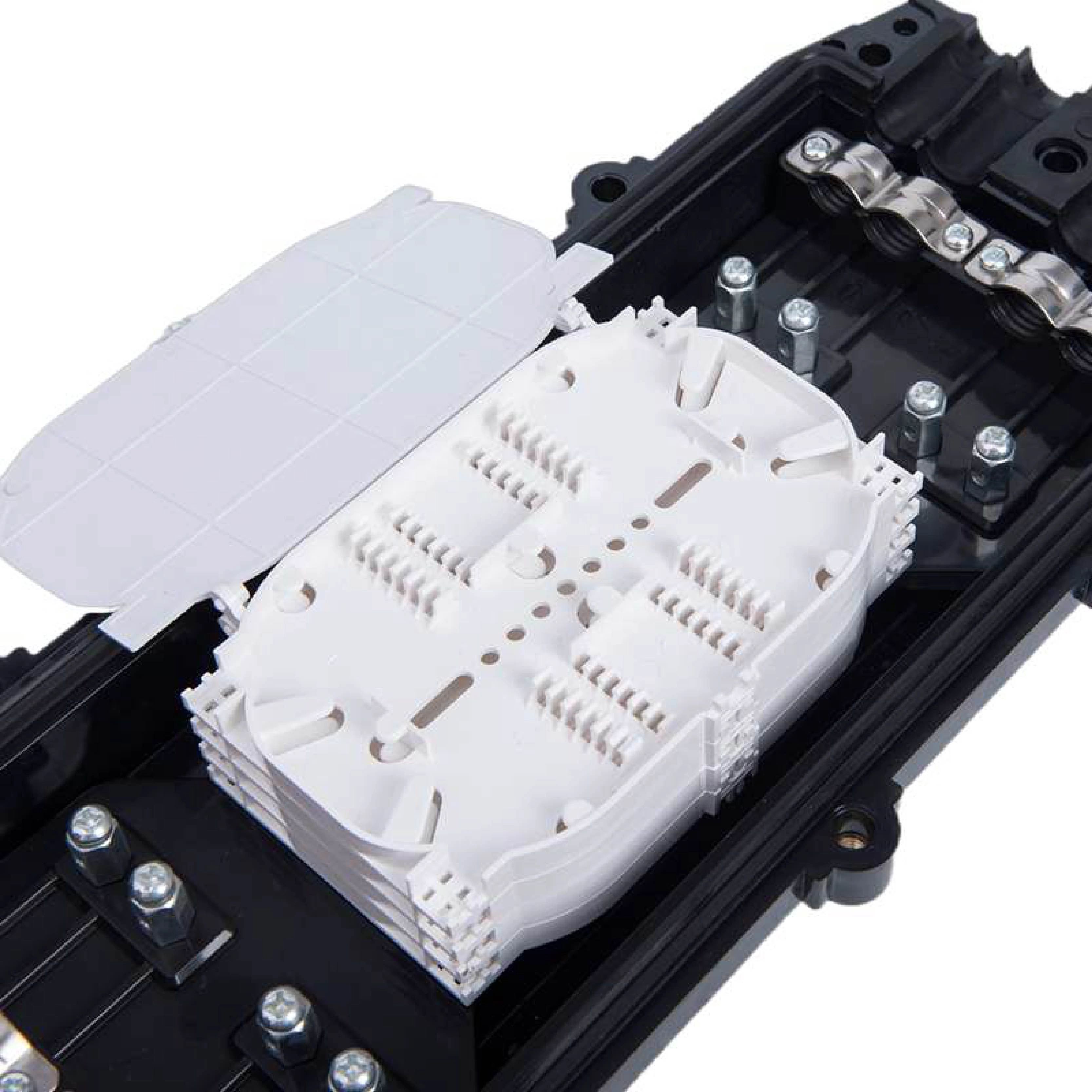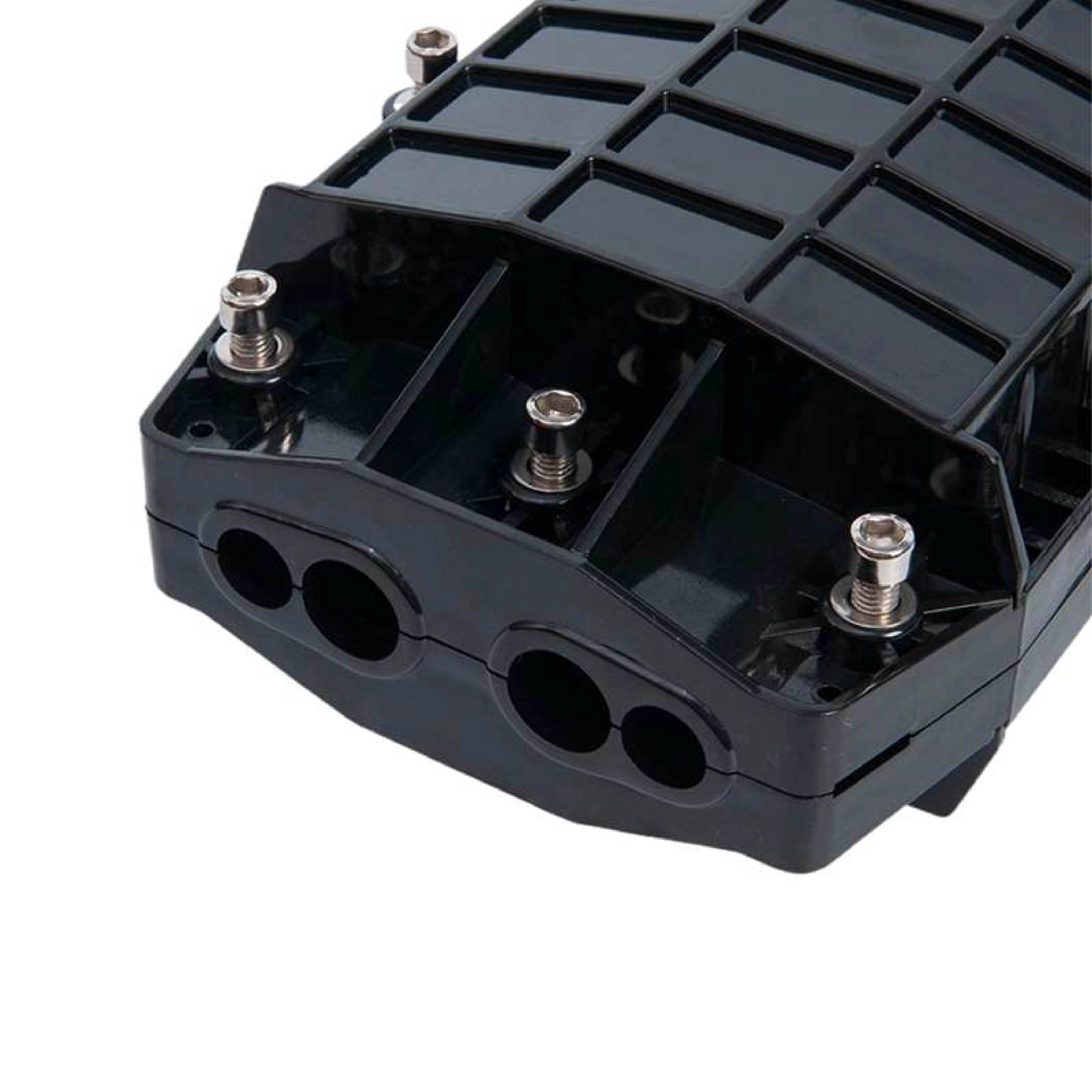 High-density inline fiber splice closure for aerial/duct/burial use, scalable to 96 cores with 4-inlet/4-outlet design in durable PC housing.