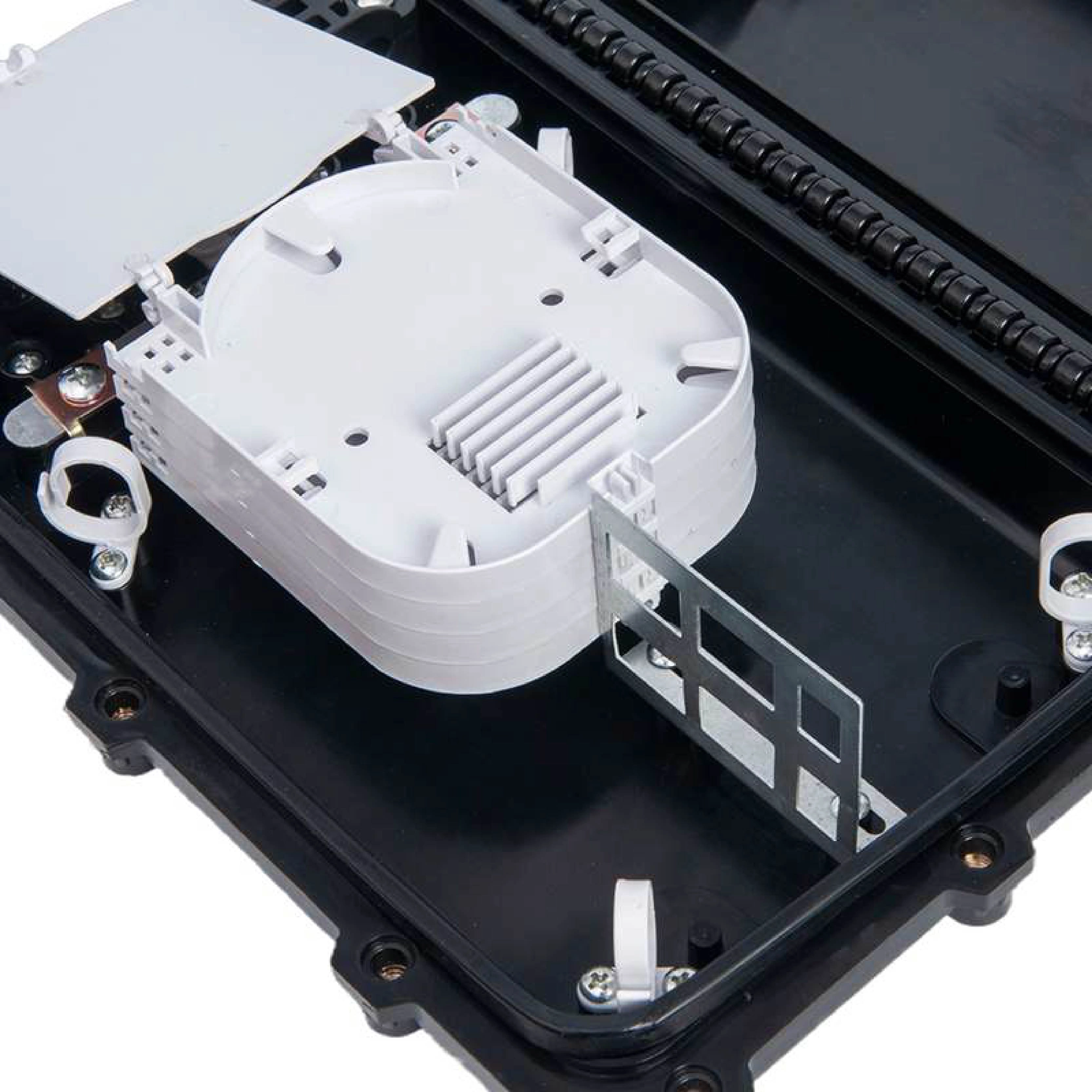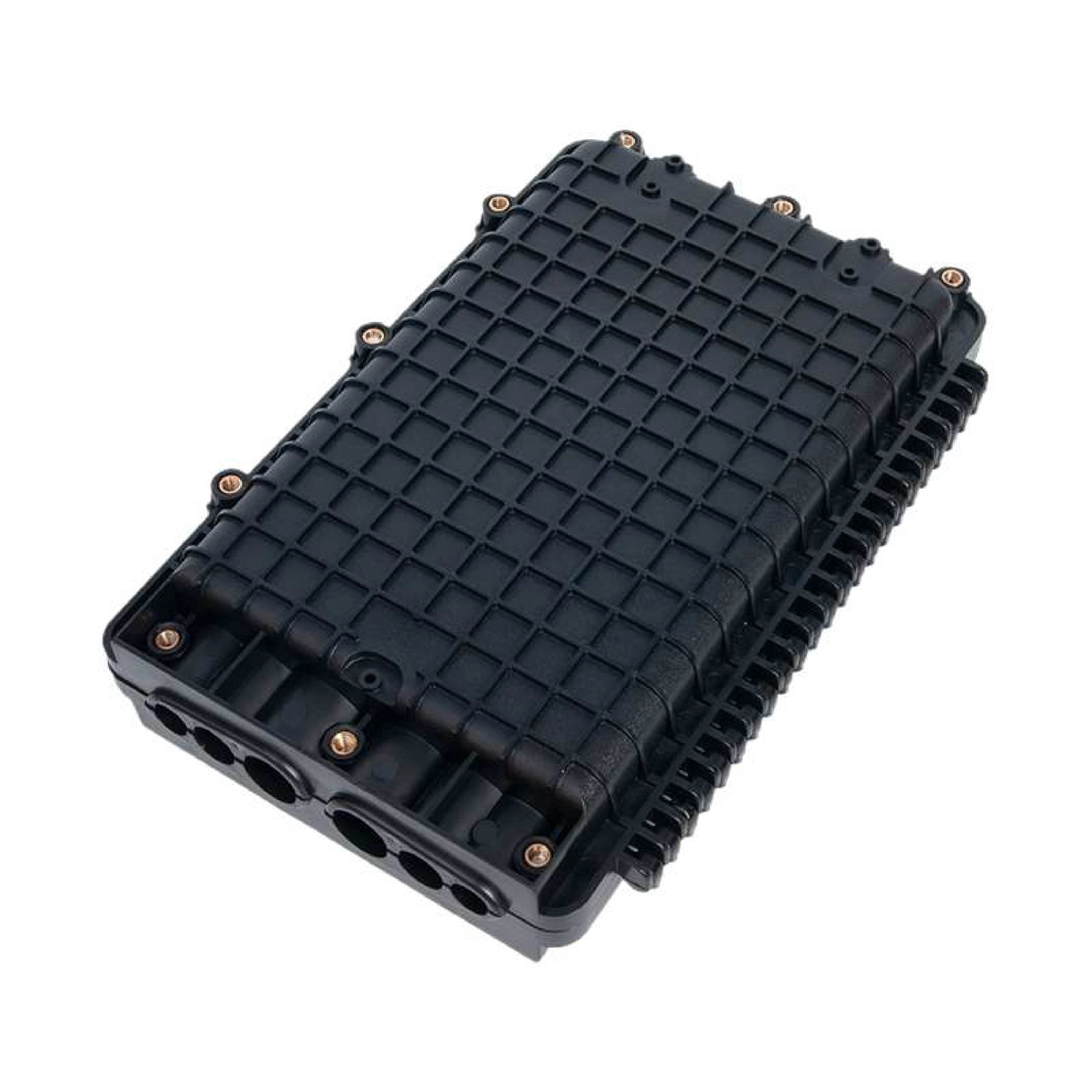 Compact inline fiber splice closure for aerial or wall mounting, scalable to 96 cores with a simple 1-inlet/1-outlet design in rugged ABS housing.