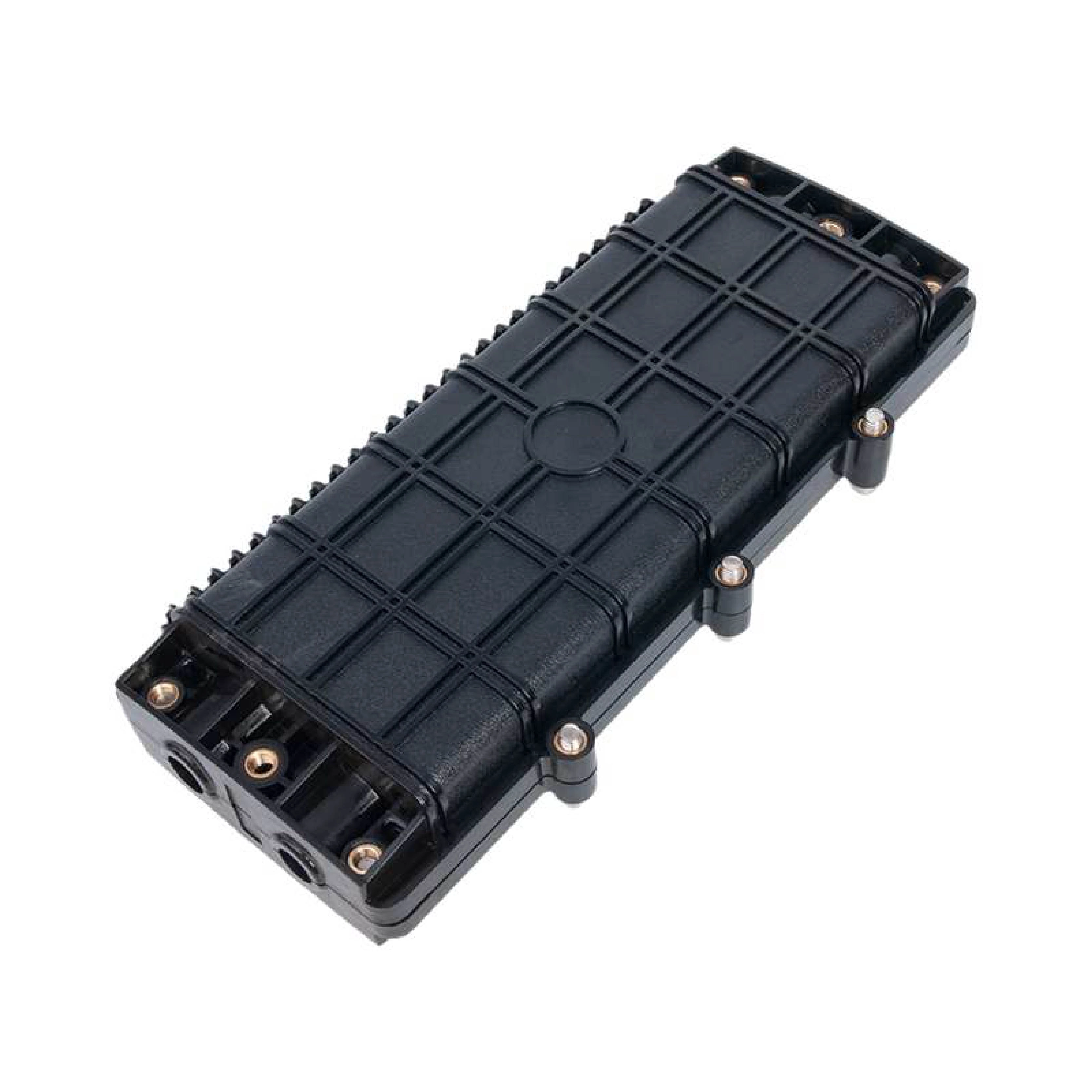 Compact inline fiber splice closure for aerial, duct, or burial, scalable to 96 cores with 2-inlet/2-outlet design in ABS/PC+ABS housing.