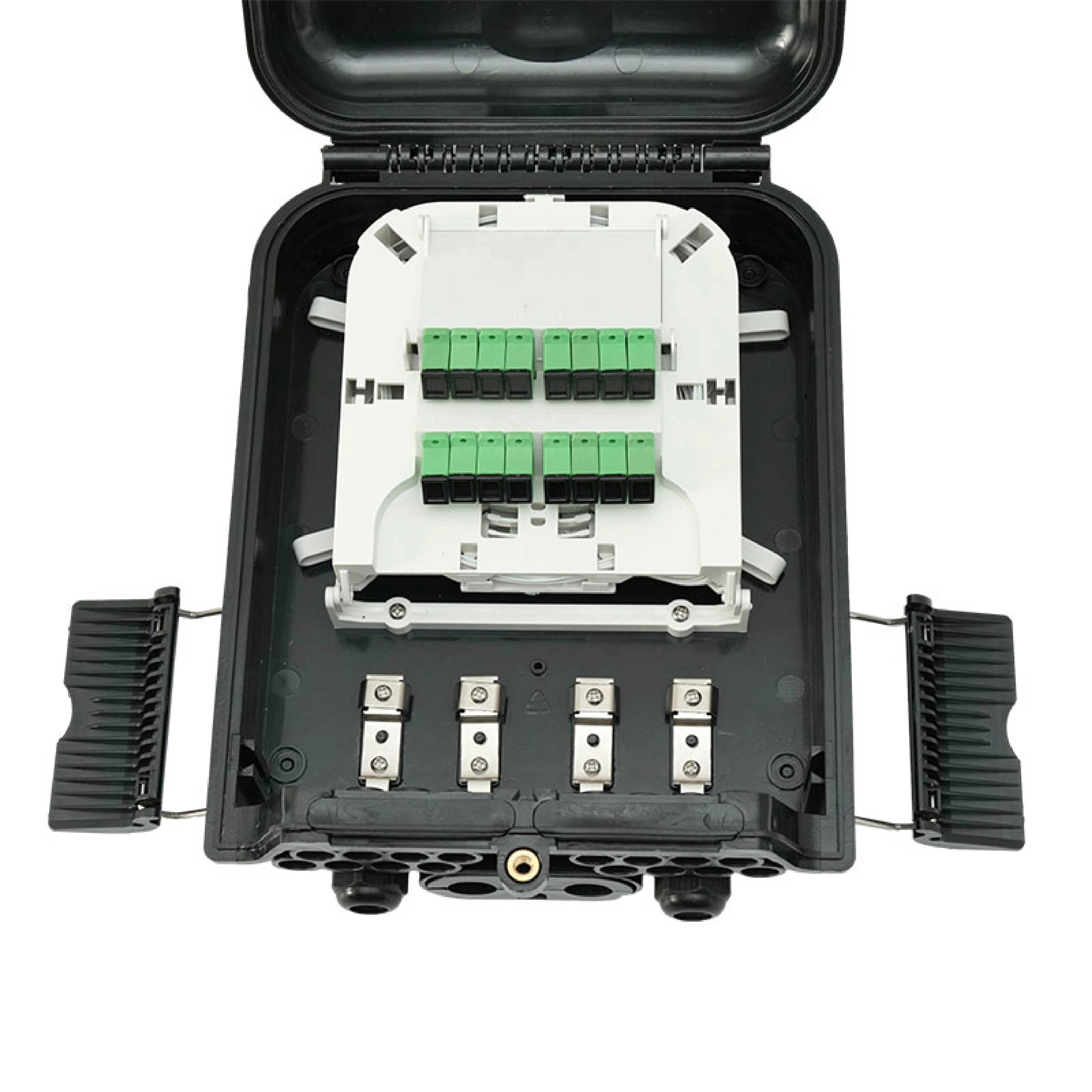 Fiber optic distribution box is a 16-core IP67 PC+ABS hub for high-density, reliable outdoor FTTH and FTTB network deployment.