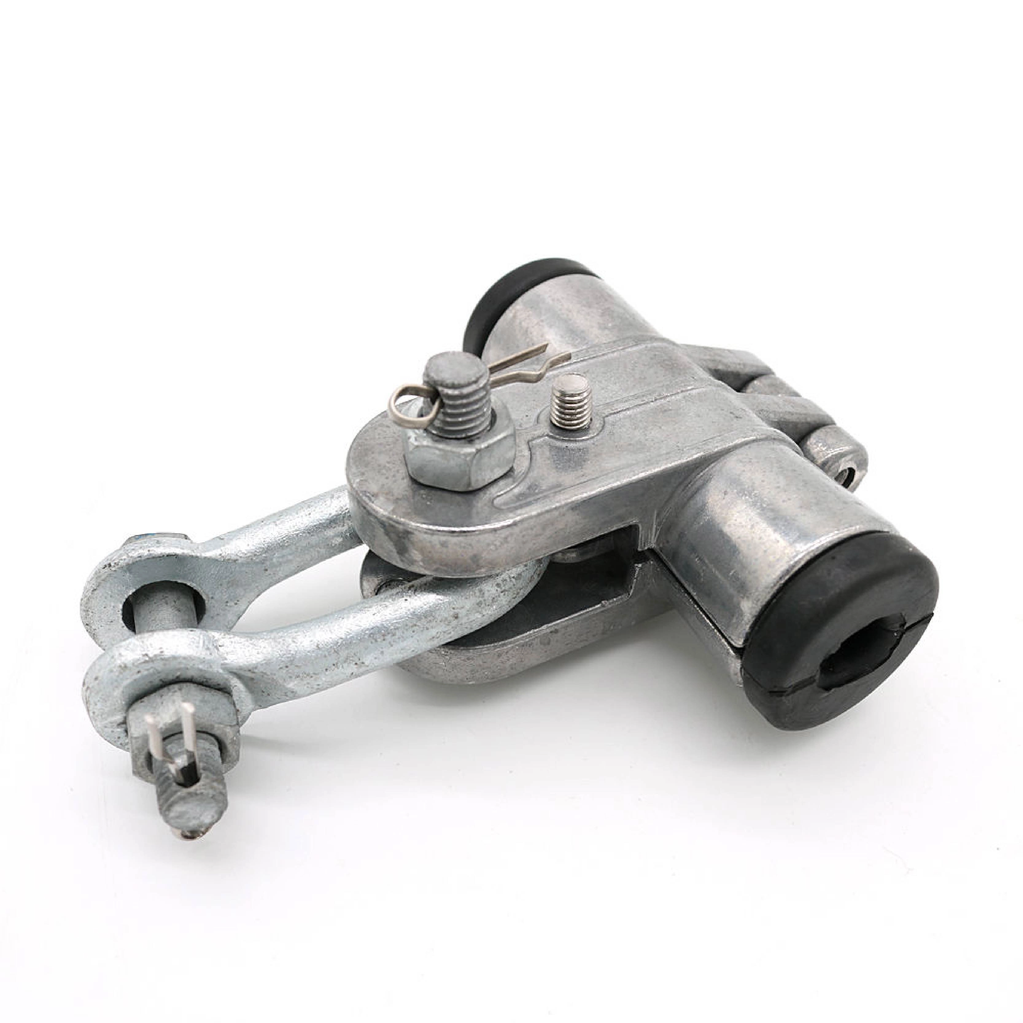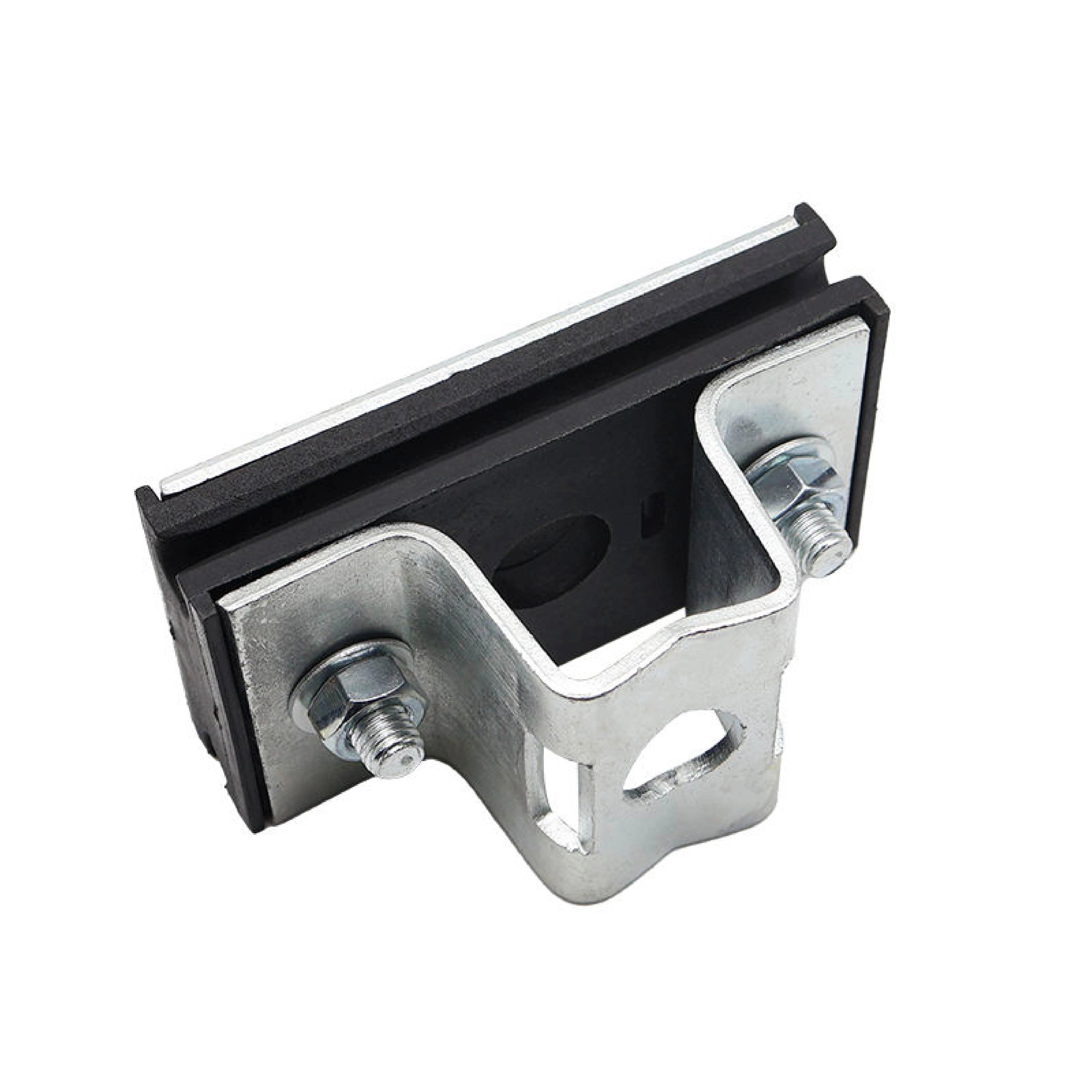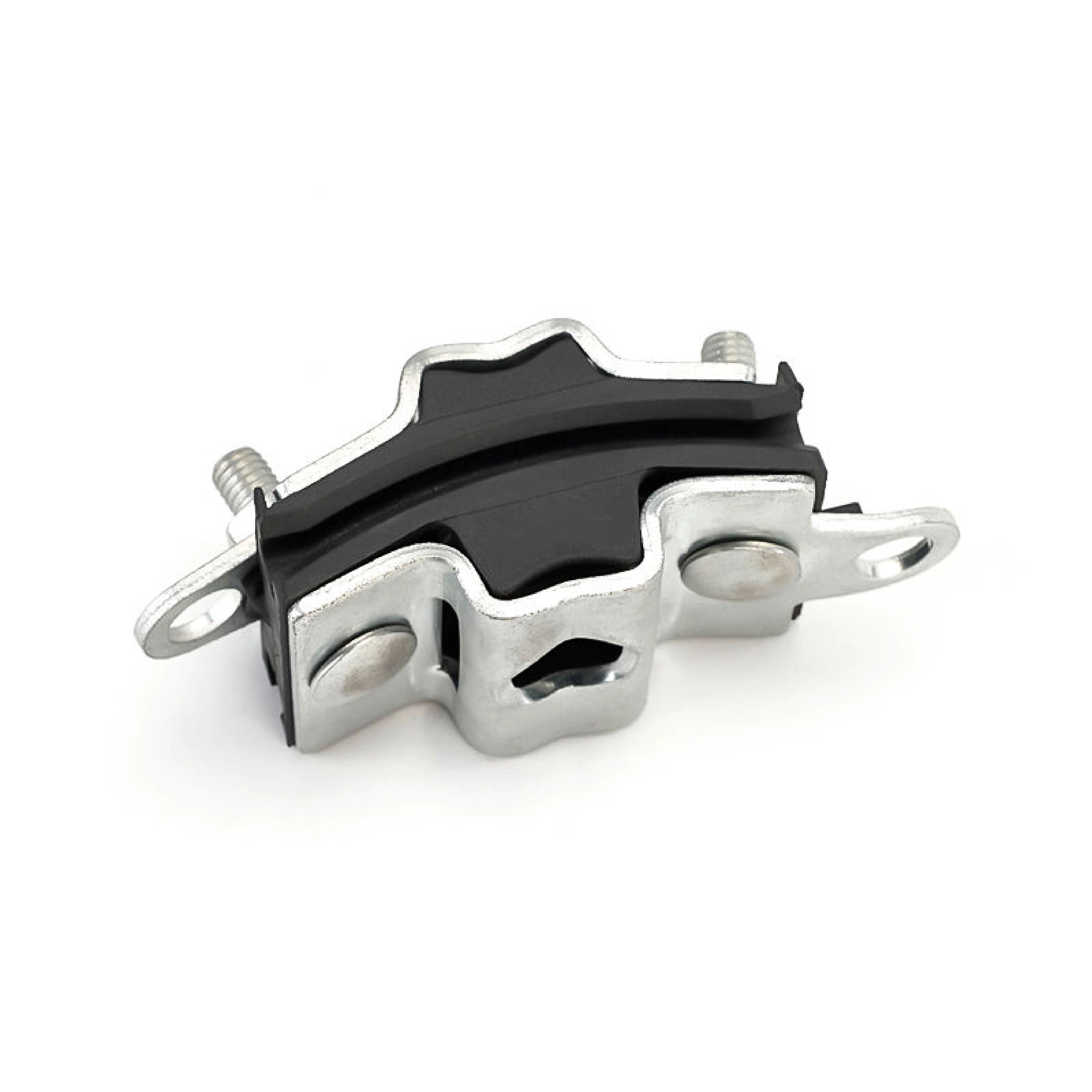 Heavy-duty galvanized steel universal pole brackets providing versatile, corrosion-resistant anchoring points for various fiber optic cable clamps on aerial poles.